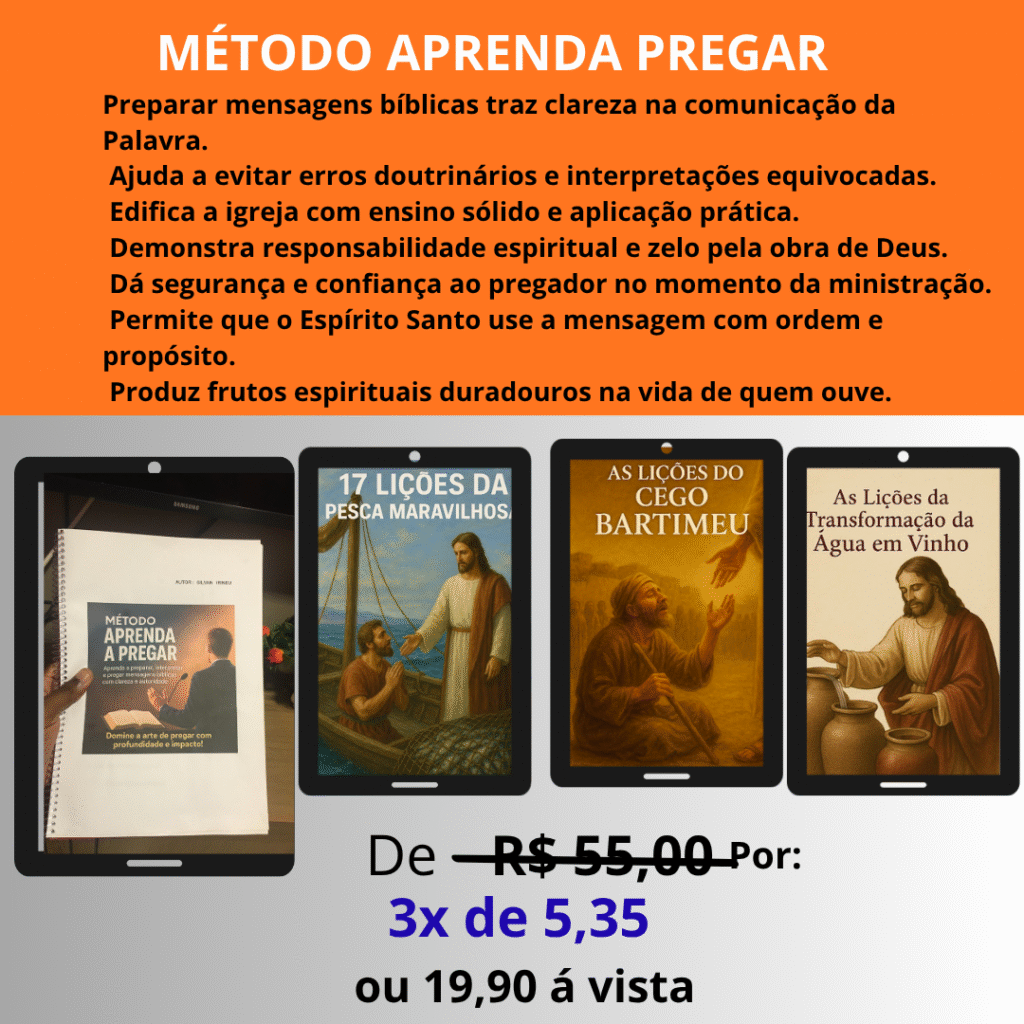 Se você sente dificuldade para montar uma pregação, organizar ideias ou transmitir a mensagem com clareza, essa apostila foi feita para você. Com 51 páginas práticas, você vai aprender o passo a passo completo para sair do zero e construir mensagens fortes, organizadas e impactantes, mesmo que hoje você não saiba por onde começar.