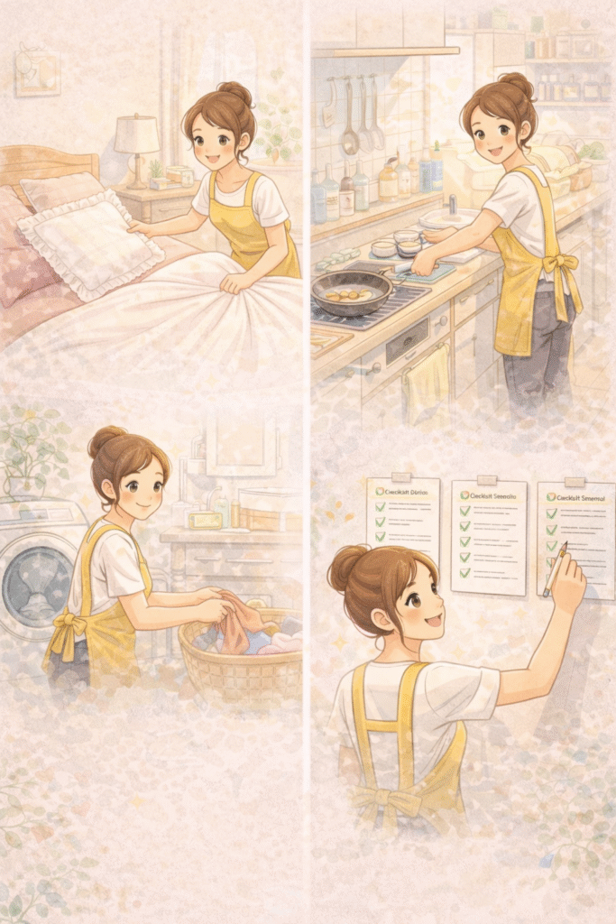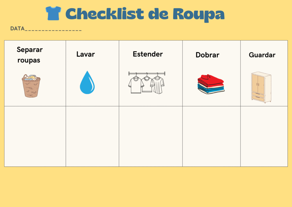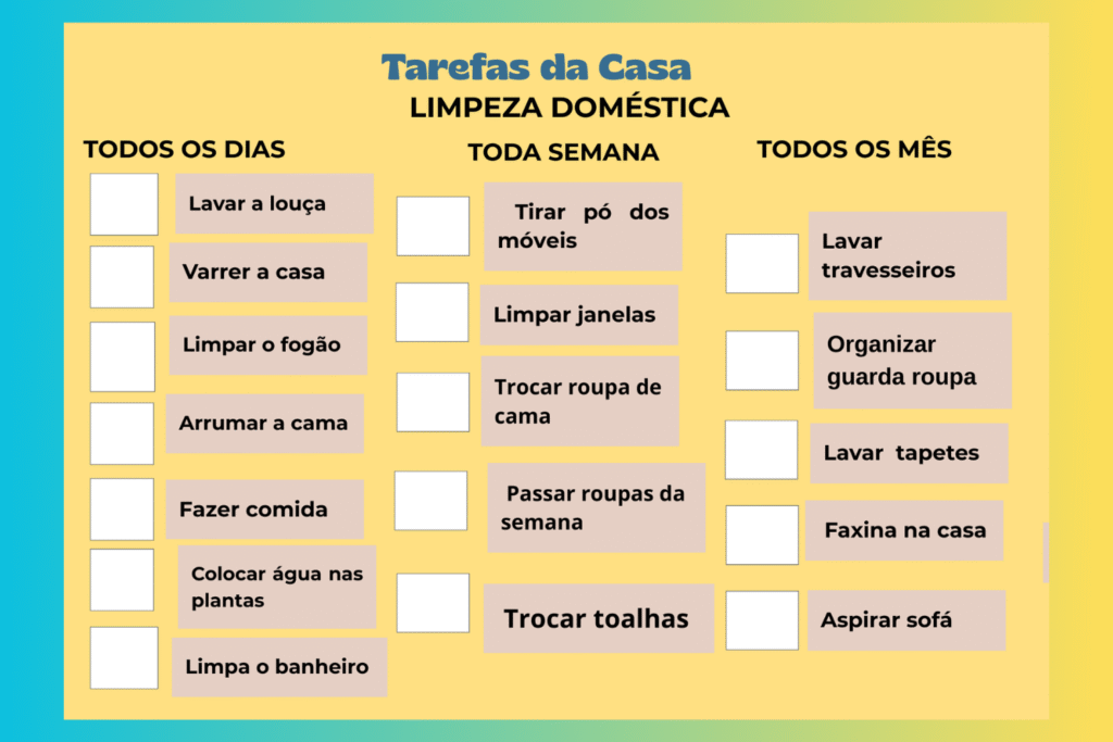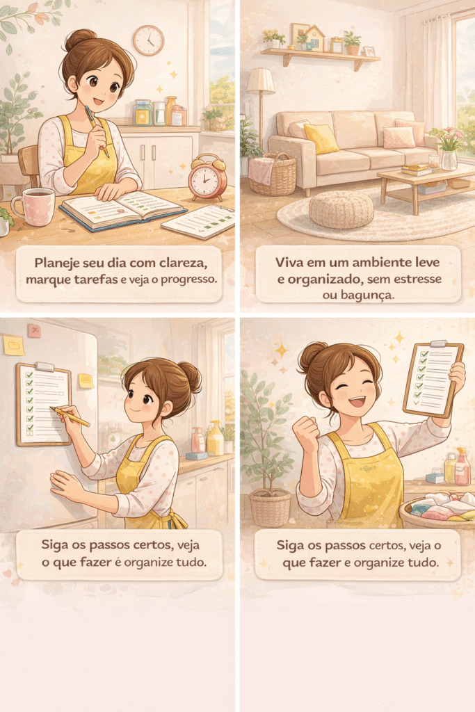 ✔ Vai dividir as tarefas por setores (quarto, cozinha, roupas, rotina).